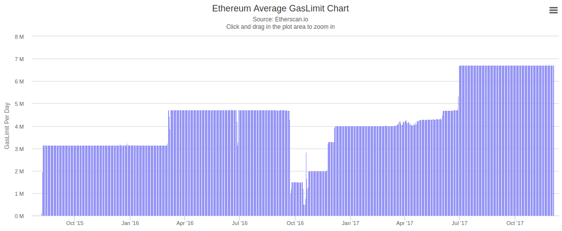 Let's look at the existing live experiment that we have in tightly coupled voting on Ethereum, the gas limit. Here's the gas limit evolution over the past two years: