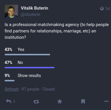 The most surprising finding for me is that "roles independent of individuals" is by far the weakest correlation. Twitter run by a democracy is the most institution-y of all, but Twitter run by a pay-to-govern scheme is as institution-y as Twitter that's just run by Elon directly. Roles being independent of individuals adds a guarantee of stability, but roles being independent of individuals in the wrong way feels too unfamiliar, or casual, or otherwise not institution-like. Dating sites are more independent of individuals than professional matchmaking agencies, and yet it's the matchmaking agencies that are seen as more institution-like. Attempts at highly role-driven and mechanistic credibly-neutral media, (eg. this contraption, which I actually think would be really cool) just feel alien - perhaps in a bad way, but also perhaps in a good way, if you find the institutions of today frustrating and you're open-minded about possible alternatives.
