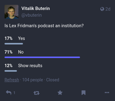 Support for (2) probably maps closely to Pourteaux's "techno-optimist" vs "techno-minimalist" distinction. Techno-minimalists don't see things like Twitter, Substack, Bitcoin, Ethereum, etc as part of the solution, though there are "Bitcoin minimalists" who see the Bitcoin blockchain as a narrow exception and otherwise want to see a world where things like family decide more of the outcomes. "Techno-optimist anti-institutionalists" are specifically engaged in a political project of either trying to replace (1) with the right kind of (2), or trying to reform (1) by introducing more elements of the right kind of (2).